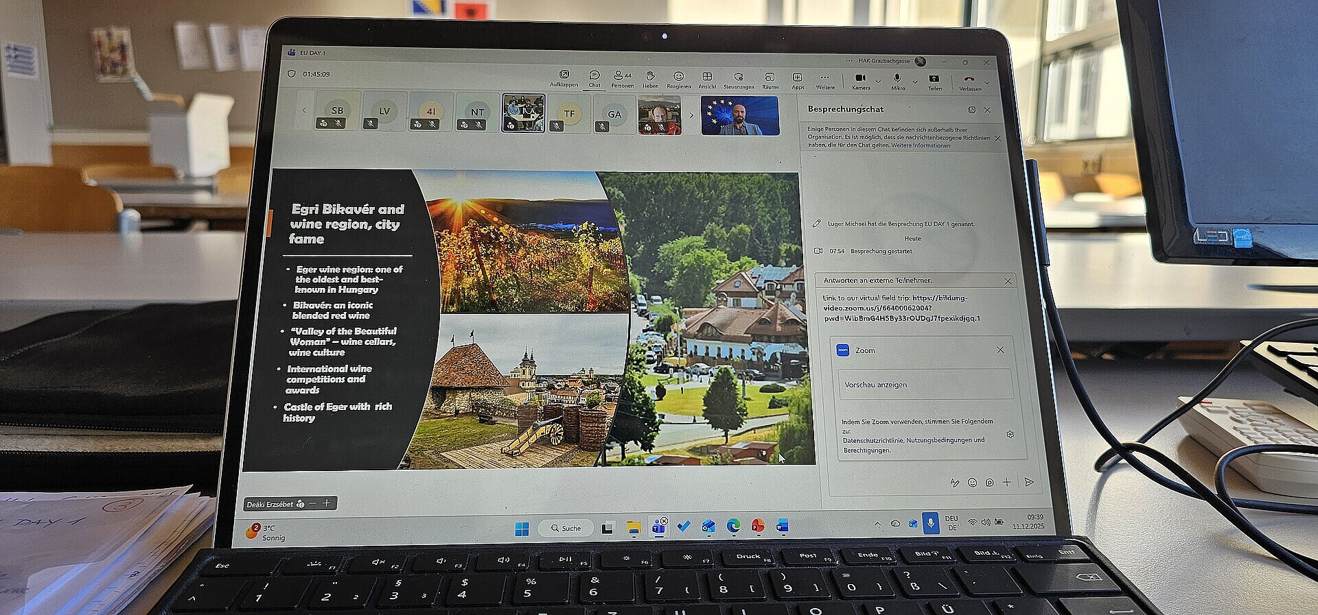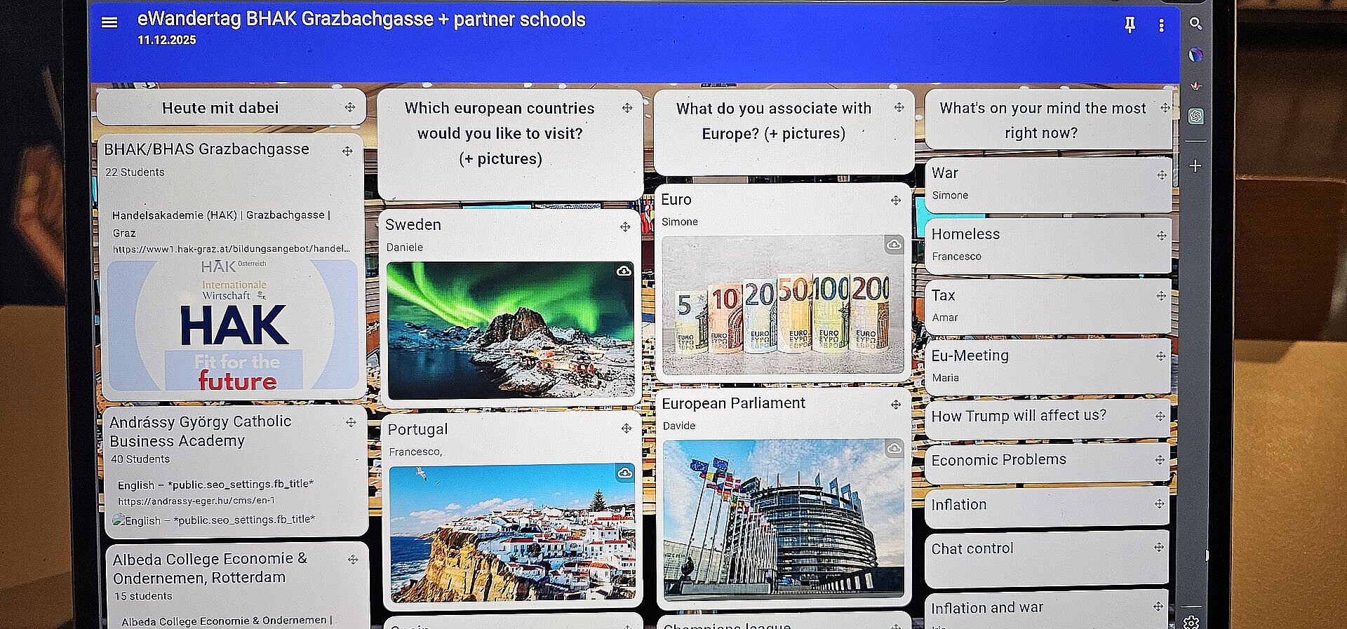 Ein herzliches Dankeschön gilt allen vier Partnerschulen aus Italien, den Niederlanden, und Ungarn, die diesen Tag mit so viel Engagement und Kreativität mitgestaltet haben. Ebenso danken wir Europe Direct Styria und allen beteiligten Mitarbeiter*innen für ihre wertvolle Unterstützung. Ein besonderer Dank geht an Frau Iris Heinzel, MSc, die den digitalen eWandertag nach Brüssel mit großem Einsatz organisiert und damit einen echten Höhepunkt des EU DAY 1 ermöglicht hat. Ohne dieses Zusammenspiel vieler engagierter Menschen wäre dieser Tag nicht so erfolgreich geworden.