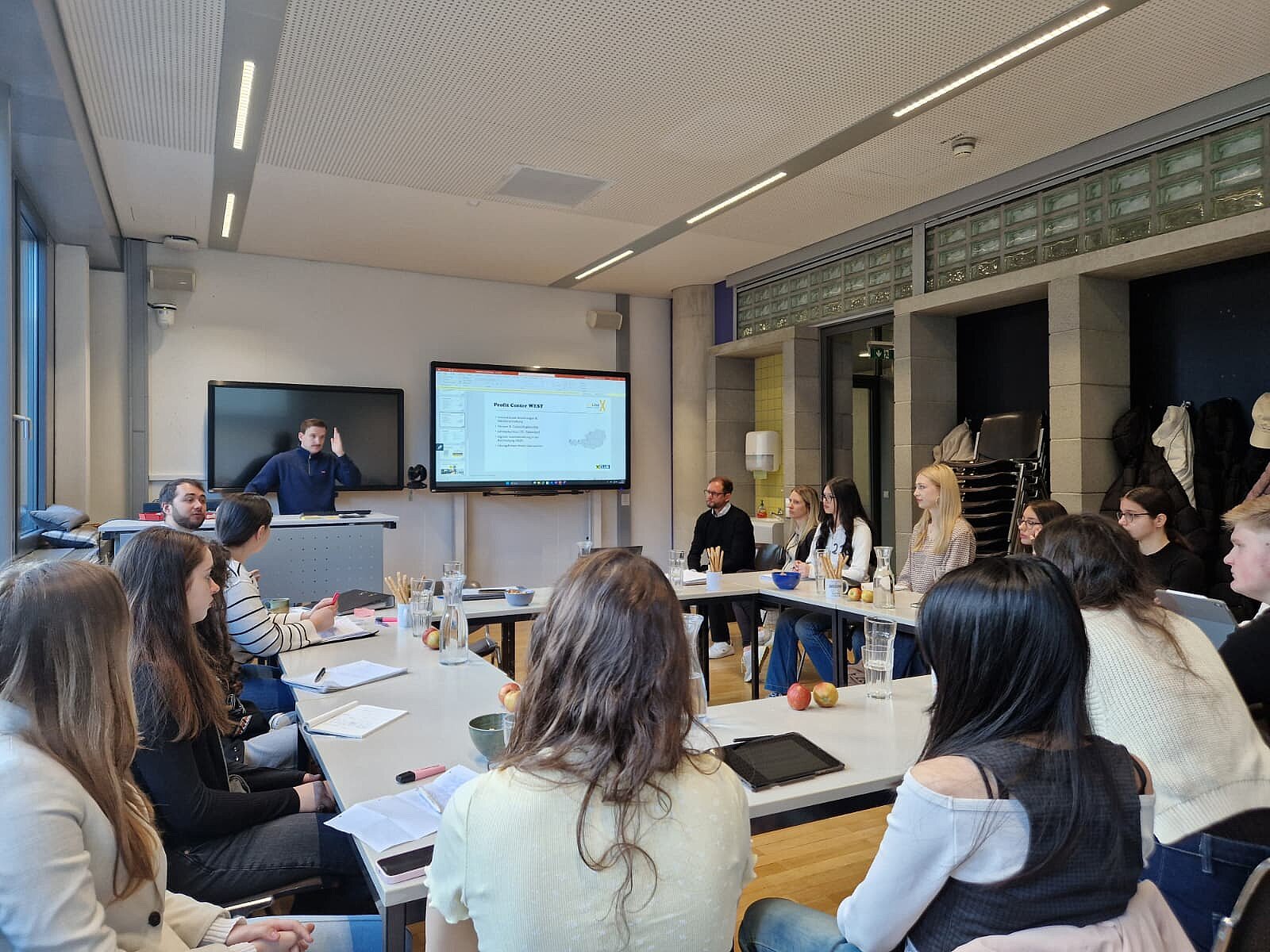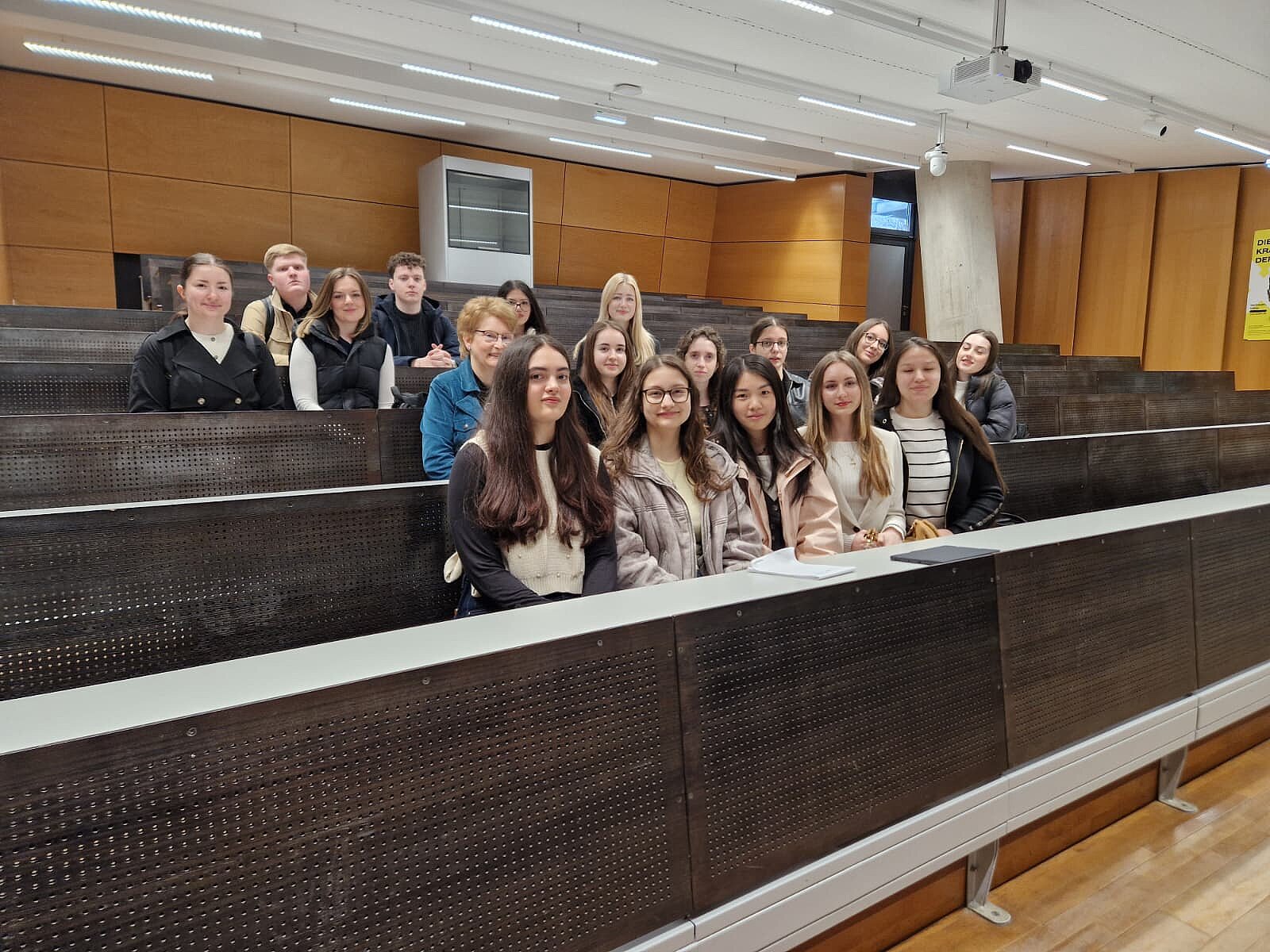 Der Vormittag begann mit einer spannenden Führung über den Campus. Wir konnten direkt erleben, wie der Studienalltag aussieht und lernten die Bibliothek, Aula und Hörsäle kennen.